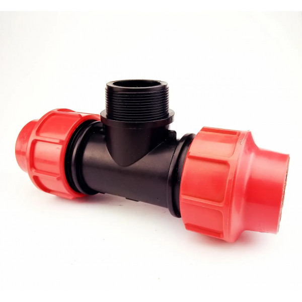Тройник для рукава Lay Flat с наружной резьбой позволяет создавать разветвление магистрали со шлангом и фитингом с наружной резьбой.